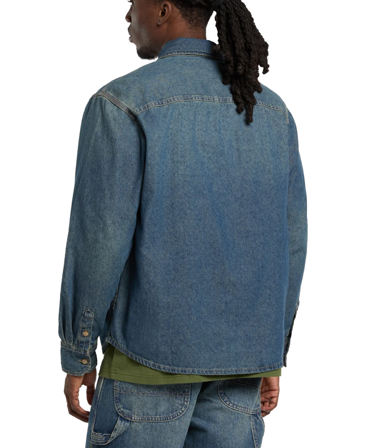 Made From 198G Slub Cotton Denim Button Placket In The Middle At The Front Rounded Hem Buttoned Cuffs Back Yoke Red Woven Dickies Label Long Sleeves